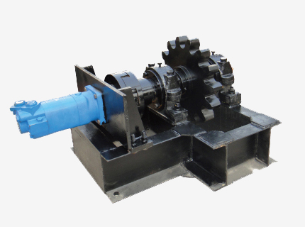 (1)推車機采用低速大扭矩液壓馬達為動力,液壓馬達驅(qū)動推車機鏈輪正反轉(zhuǎn)動,鏈輪進一步帶動鏈條傳動,鏈條牽引推爪或拉爪實現(xiàn)推拉礦車的功能。